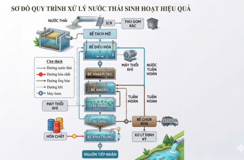 Quy trình xử lý nước thải sinh hoạt theo sơ đồ tiêu chuẩn gồm các công đoạn: song chắn rác, tách mỡ, điều hòa, xử lý sinh học (kỵ khí – thiếu khí – hiếu khí MBBR), lắng và khử trùng. Hệ thống giúp loại bỏ BOD, COD, Amoni hiệu quả, đảm bảo nước đầu ra đạt chuẩn khi kết hợp vi sinh Microbe Lift IND và Microbe Lift N1.